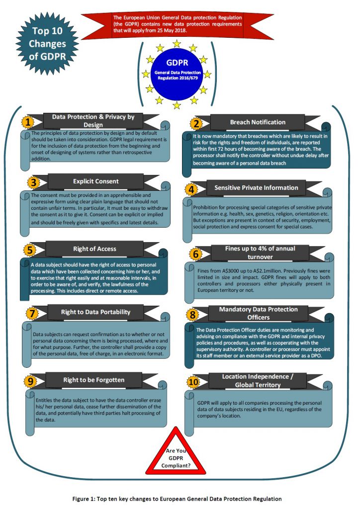 General Data Protection Regulation will impact many areas of an organisation including data, technology and legal compliance. This paper notes that Australia has already started to be compliant with EU-GDPR law on the protection of natural persons information regarding the processing of personal data and on the free movement of such data, and repealing directive 95/46/EC. The key legislation regulating privacy in Australia is the Privacy Act 1988 aka the “Privacy Act”. Significant amendments to the Privacy Act were passed on November 29, 2012 and came into effect on March 12, 2014.