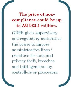 If your organisation or business offers products, goods or services to customers residing in the European Union (EU) or monitors their behavior for research or monitoring, you could be victim of GDPR penalties even if your business does not operate in or from EU or have any physical presence in the EU. Although the GDPR may not be in the priority list for many Australian businesses, they could face large potential fines if they are in breach of the GDPR when it comes into effect on 25th May 2018. The global reach of businesses today puts greater emphasis on Australian organisations to comply with GDPR consciously and efficiently while adhering their local rules and regulations. Australian business that may be covered by the GDPR regulation include: