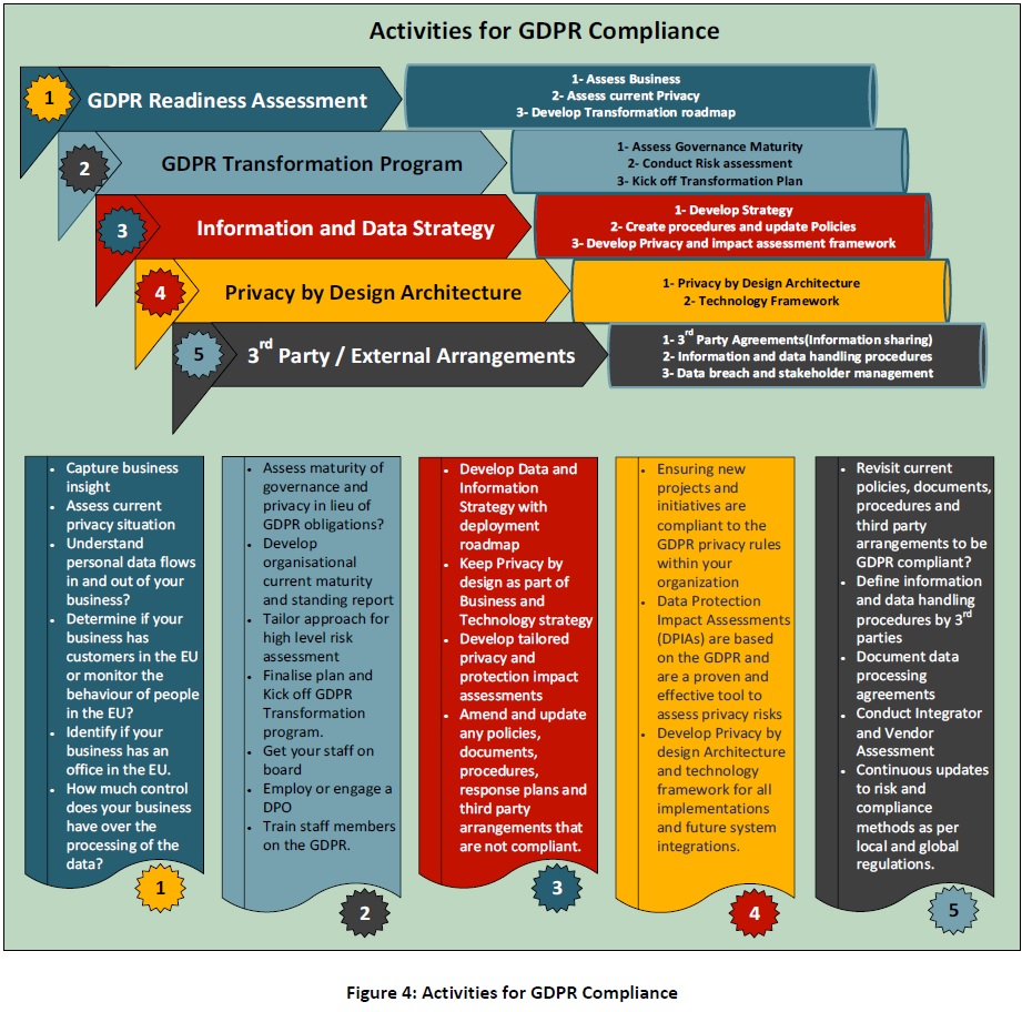 The following figure shows what key actions and activities needed to be performed for a successful GDPR adoption and transformation program. To cope up with the upcoming change in May 2018, Now is the time for Australian businesses and organisations to take a detailed examination of their current privacy and compliance programs as well as data breach processes to ensure basic setup to meet new requirements.